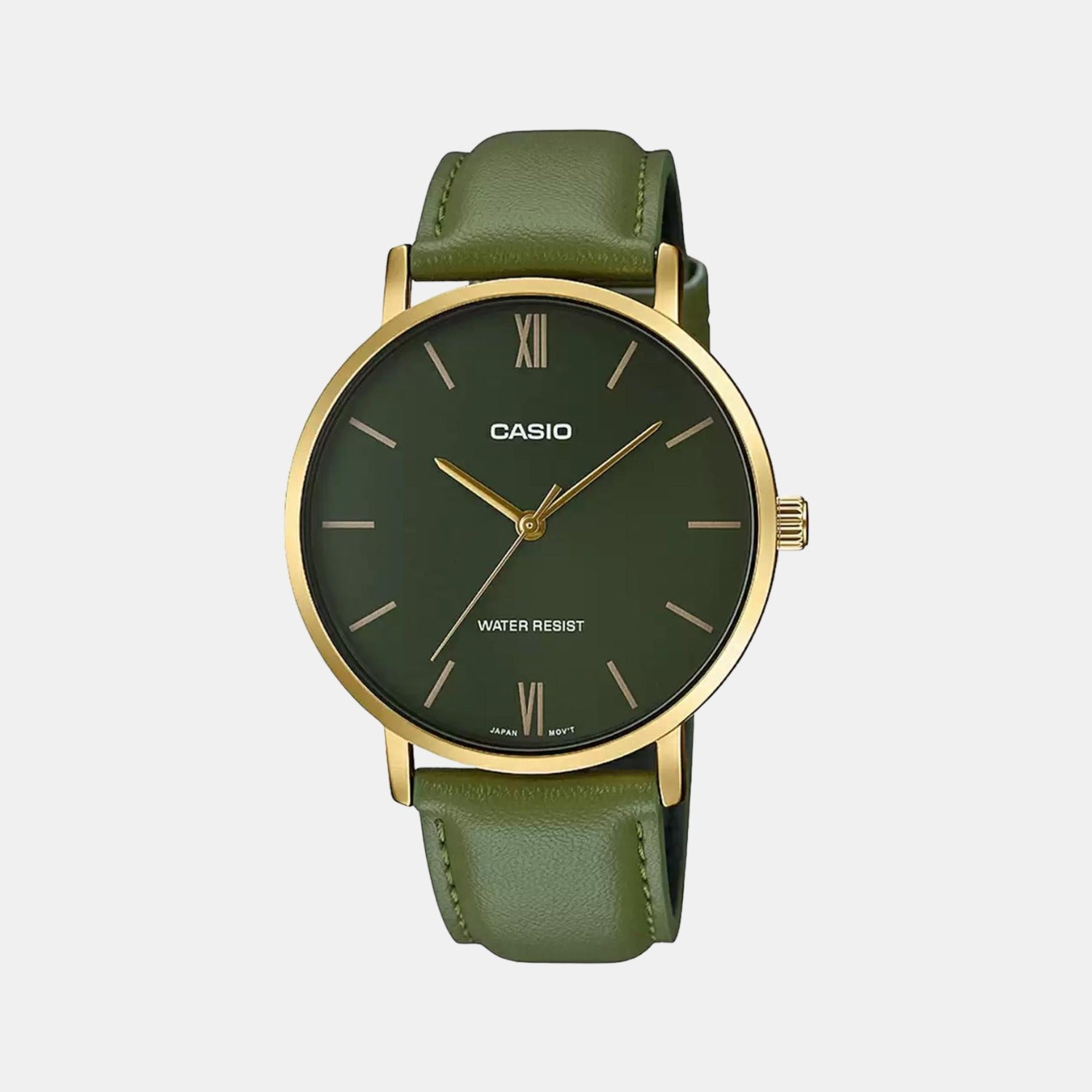 Discover Casio watch for men, featuring a green dial, a green strap made of leather in a round case. Built with mineral glass and stainless steel body to balance clarity and durability. Dimensions include 40 mm dial size, 20 mm strap width, 9 mm profile for comfortable wear. Key features: quartz movement, analog display, 3 atm water resistance. A secure buckle clasp ensures a dependable fit.
