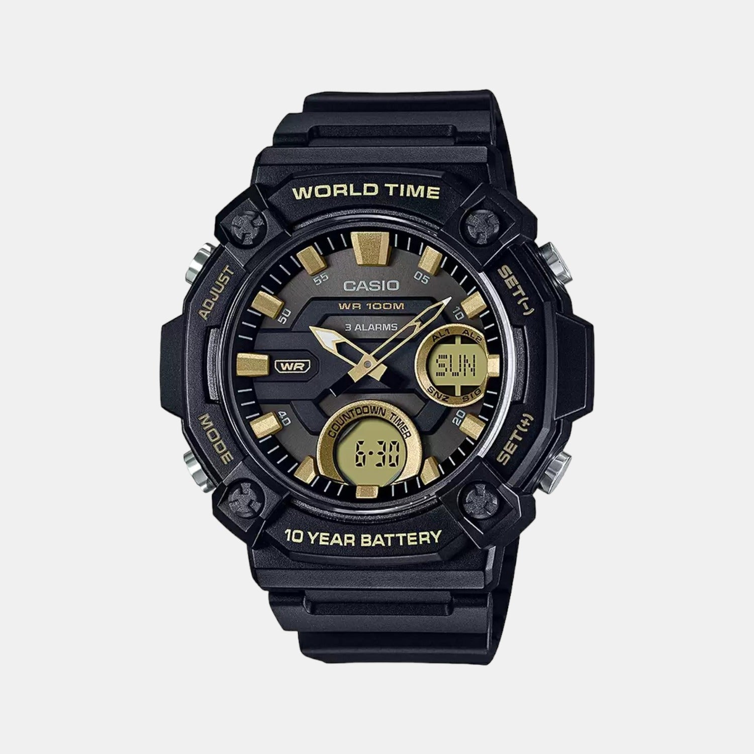 Discover Casio watch for men, featuring a black dial, a black strap made of resin in a round case. Built with mineral glass and resin body to balance clarity and durability. Dimensions include 53 mm dial size, 18 mm strap width, 16 mm profile for comfortable wear. Key features: quartz movement, analog-digital display, 10 atm water resistance. A secure buckle clasp ensures a dependable fit.