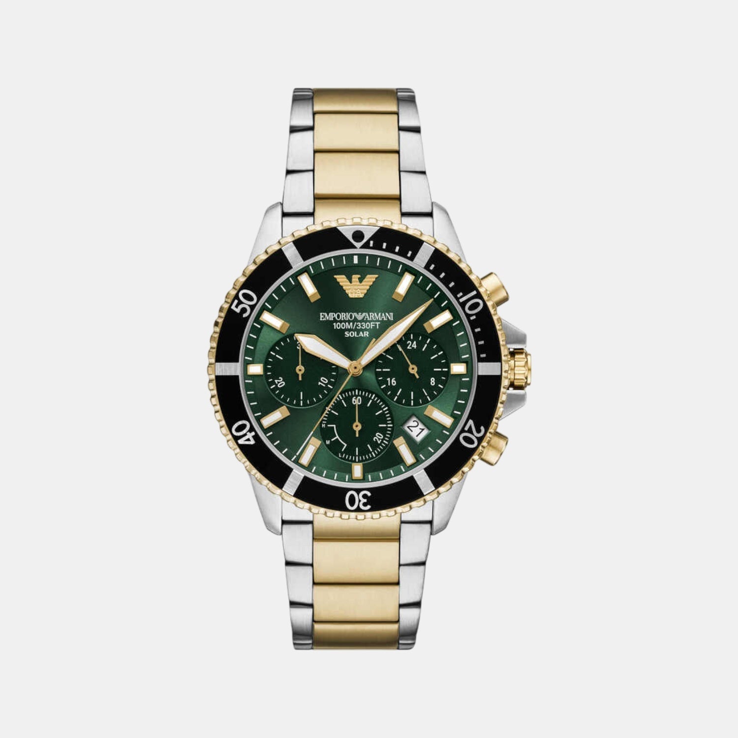 Emporio Armani's 43.5mm World Explorer solar-powered chronograph watch features a green sunray dial, sapphire crystal, and a two-tone stainless steel bracelet. Its solar-powered movement ensures reliability and eliminates the need for frequent battery replacements. This watch can run for up to 5 months on one full charge.
